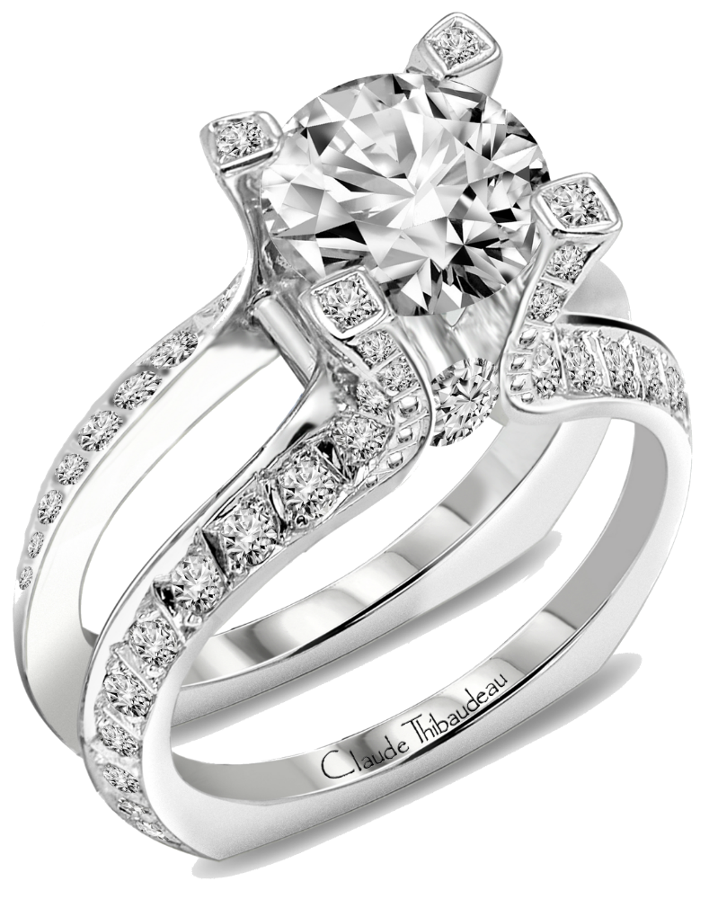 This luxurious 18k white gold design features a split shank allowing for interchangable bands to be paired with it. This design features .82twt round brilliant cut white diamonds.