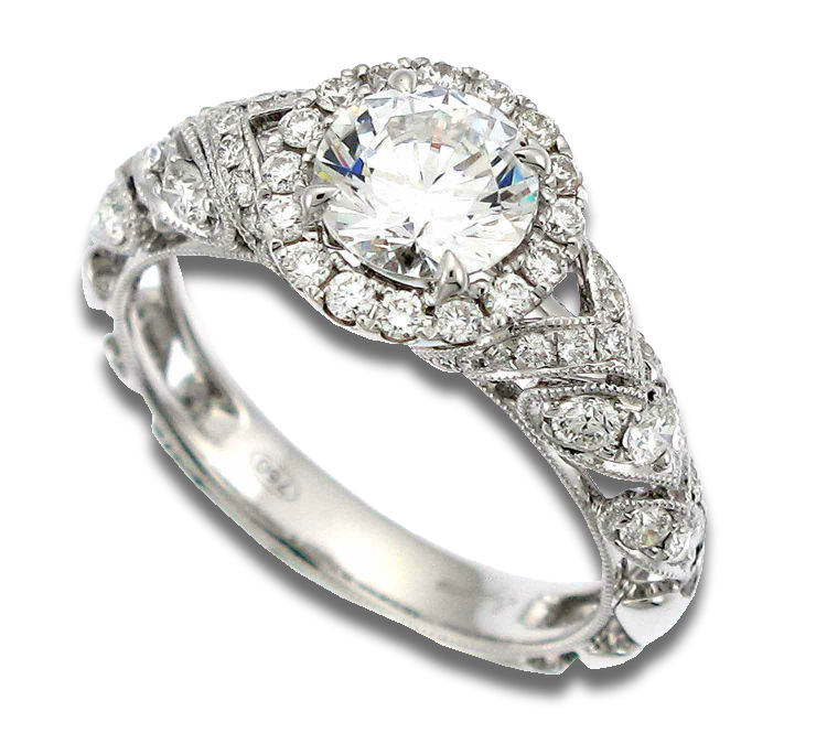 18k white gold designer semi-mount halo engagement ring, with .71ctw. of round brilliant cut diamonds, making up a beautiful heart motif.