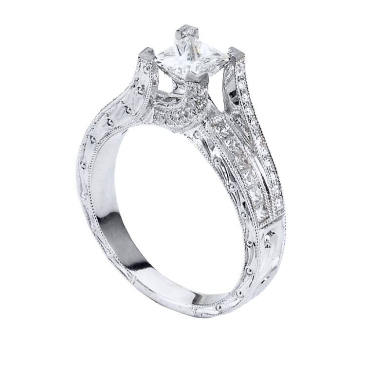 Antique with a twist white gold designer semi-mount engagement ring, this ring mixes modern designs with old world skills, with channel set princess cut diamonds and pave set round brilliant diamonds you think that would be enough but with a hand engraved shank and millagran around the channels. this ring is the complete package.