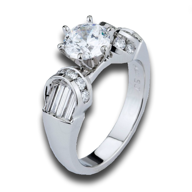 Astounding 14k white gold and diamond designer semi-mount engagement ring, with 6 baguettes totaling 0.50cts and 10 round brilliant cut diamonds totaling 0.32cts. giving the ring a total weight of 0.82cts.