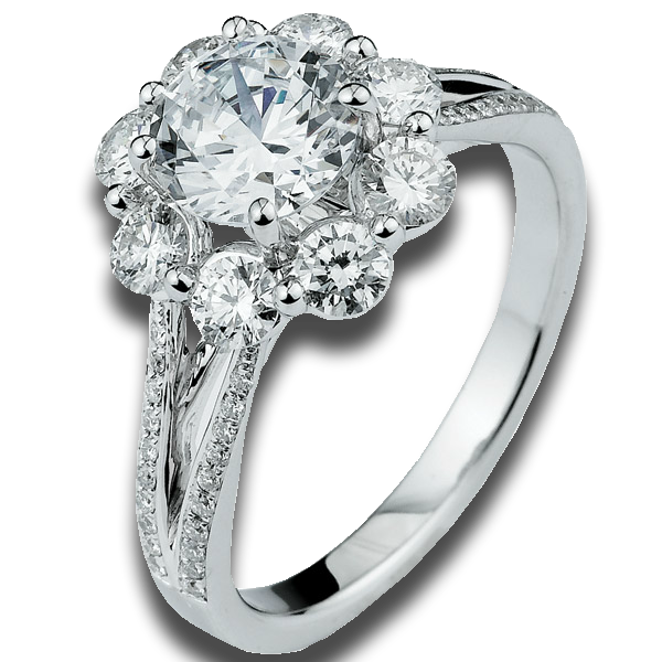 14k white gold engagement ring with a split shank design featuring .52cts twt round brilliant cut white diamonds.