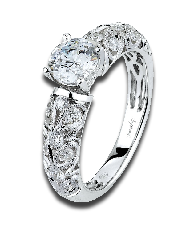 18k white gold diamond semi-mount engagement ring, this ring is a work of art the 0.20cts worth of diamonds the ring also boasts hand engraving, millagran and a motif of hidden hearts and butterflies.