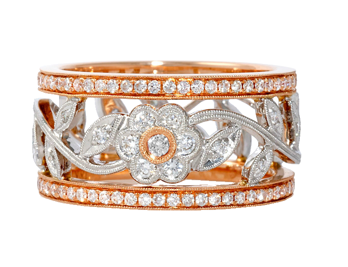 This stunning and elegant design features a variety of details. Containing .77twt round brilliant cut VS1-G diamonds set in 18k white and rose gold.The beautiful floral pattern with its milgrain texture make this a dazzling design.