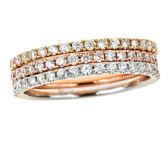 18k Tri Color diamond ring featuring three rows of prong set white diamonds with a total weight of .55cts