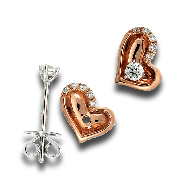 14k rose gold diamond heart earring jackets complete with diamond studs set in 14k white gold.