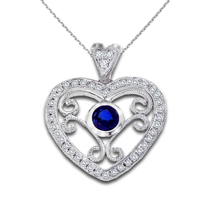 14K White Gold Precious Round Sapphire and Diamond Filigree Heart Fashion Pendant