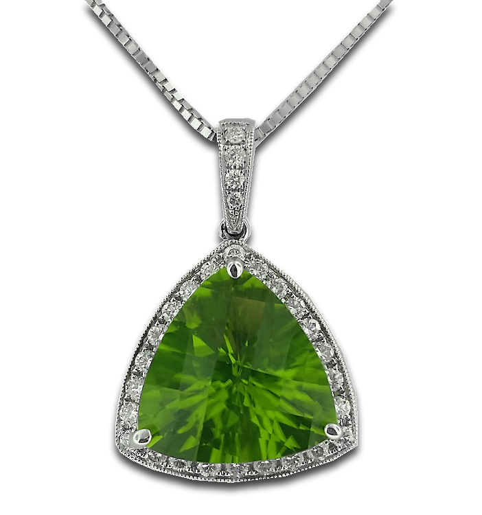Crafted in 18k white gold this stunning design features an electric 7.30ct trillion cut Peridot with 1/2ct twt round brilliant cut Diamond accents.