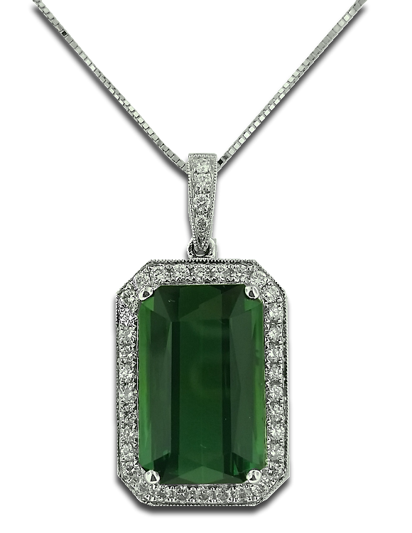 This absolutely stunning pendant showcases an 8.42ct deep forest green Tourmaline lined with round brilliant cut white Diamonds accented by a milgrain beaded edge.
